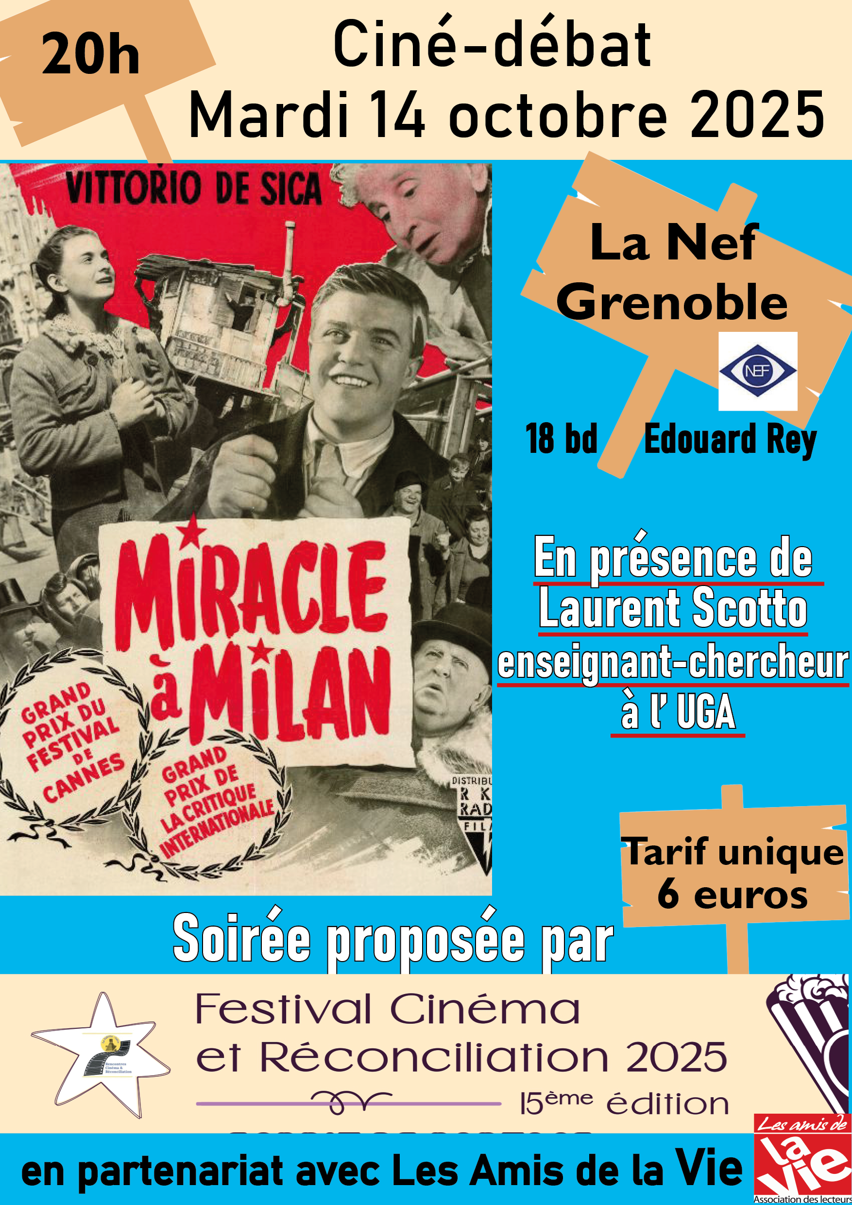La prochaine avant l'ouverture du festival 2025 a lieu au cinéma LA NEF de Grenoble en présence de Laurent Scotto (UGA) présent pour animer le débat et apporter des clés de lecture après la projection du film "Miracle à Milan de Vittorio de Sica (1951).